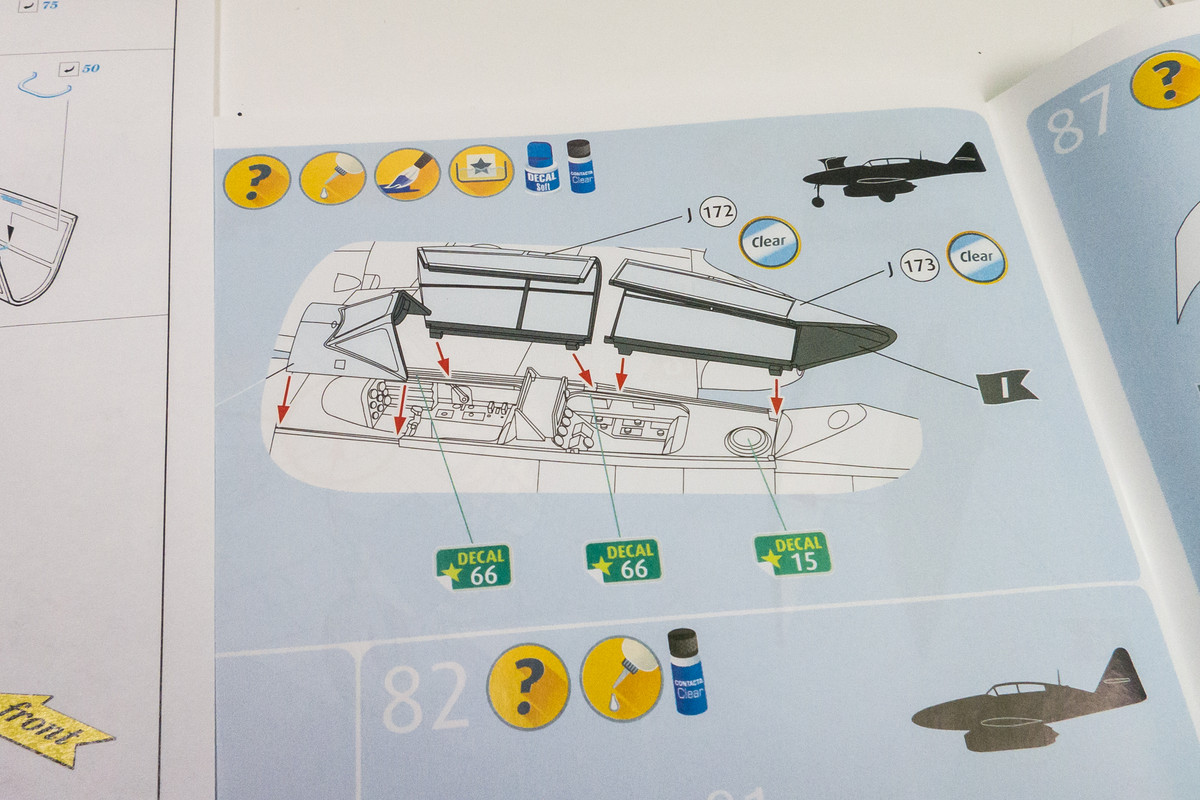 Thunnus Posted November 18, 2020 Author Posted November 18, 2020 After I've verified that decals over kit parts is a viable approach to the cockpit, I started looking at the pilot side panels. Once I've committed to the decal approach, I think I need to follow through with this throughout the cockpit. The build of the 262B interior is not exactly simple. There is no cockpit "tub" to speak of and front and rear cockpits are separated. And the bottom of the cockpit forms the ceiling of the wheel wells. So I thought it would be a good idea to slow down and take a good look at kit instructions as well as the Eduard photoetch instructions to form a more cohesive strategy. There are some photoetch parts that I'm planning on using such as the Revi gunsight. There are also some mix-and-match opportunities like using the photoetch frame for the kit-supplied radar equipment box. Something in the Eduard instructions that puzzled me. Can anyone clarify the component shown on the bottom of the page that is mounted on the rear of the forward canopy? It is not the radar equipment housing, which is represented as Assembly Y below. The Revell instructions show nothing there. I assume this is object in question mounted on Red 6 (110306 aka FE610). But it does not appear to be present on Red 10 (110635), which is the machine I'm planning to depict. scvrobeson, AlbertD, Derek B and 6 others 9